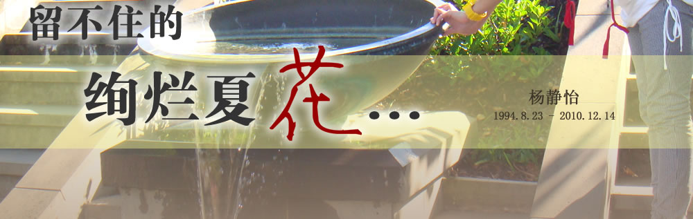 留不住的绚烂夏花,杨静怡,亲爱的小静怡,你在阳光最饱满的夏季绽放,如奔驰、跳跃、飞翔着的生命精灵,你以此诠释了生命的辉煌与灿烂!夏花虽凋零,但它辉煌与灿烂的光芒将永远闪耀在人间!